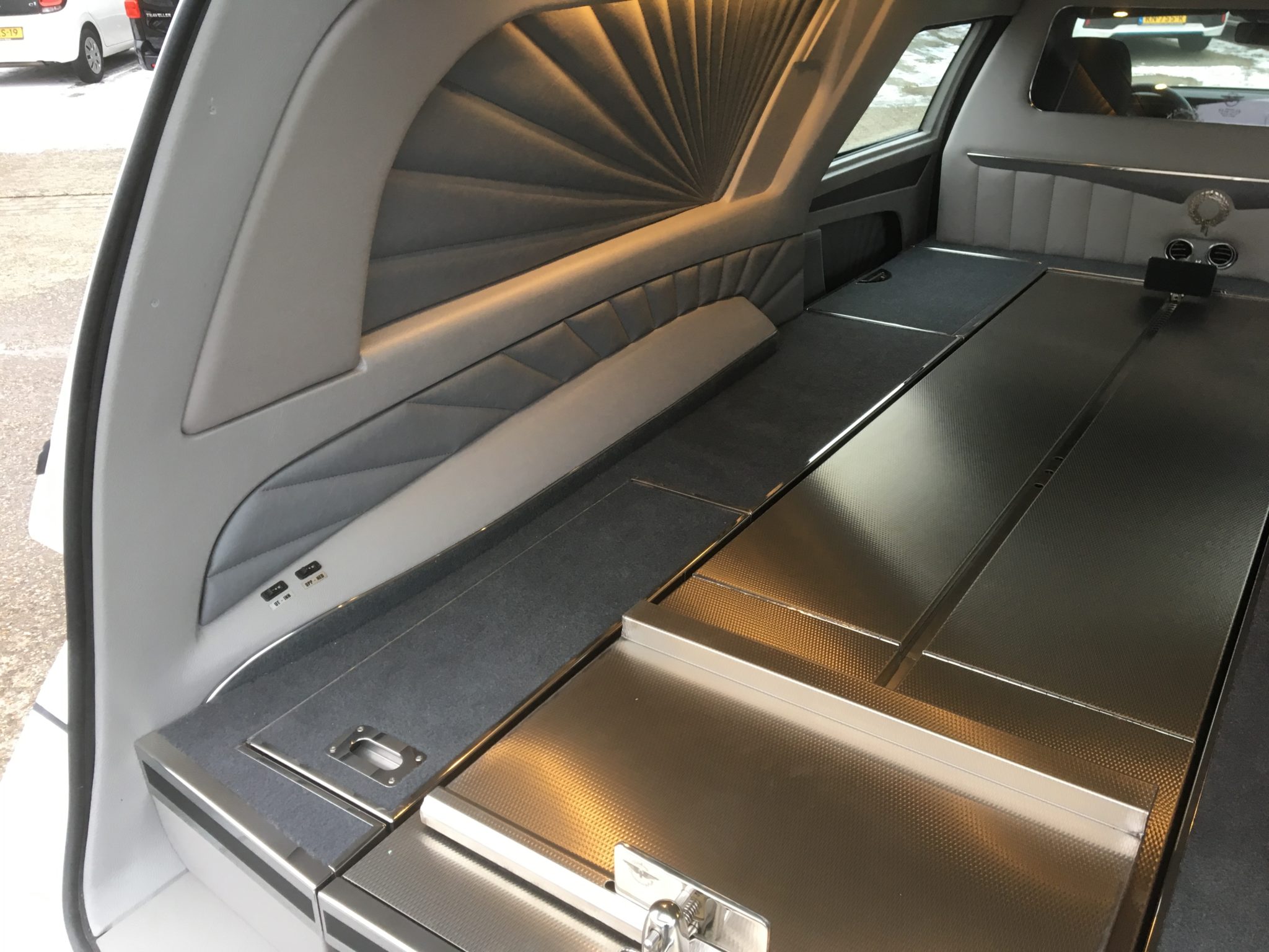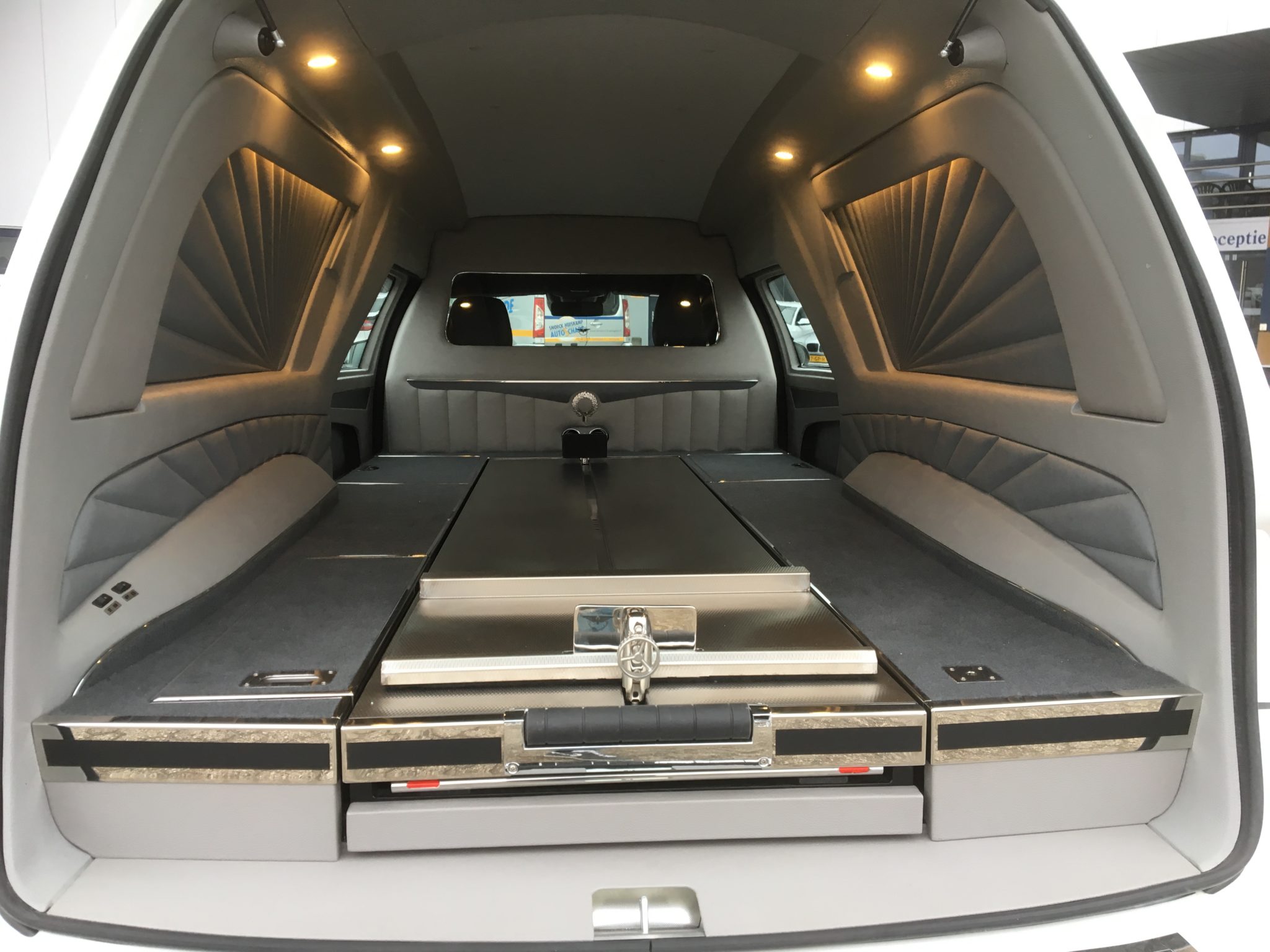 Der Huiskamp Landau wurde introduziert in 2010 und ist jetzt schon ein echter Klassiker mit seinem würdigen Landaulet Vinyldach. Das Fahrzeug ist mit 5 kompletten Seitentüren versehen. Durch die Türen sind die verschiedenen Schränke, Schubladen und Fächer gut zu erreichen. Alles wird nach Ihren Wünschen entworfen und entwickelt, damit sich Ihrer Scherenwagen. Ihre Koffer, Kühler und sonstige Utensilien immer in bequemer Reichweite befinden.